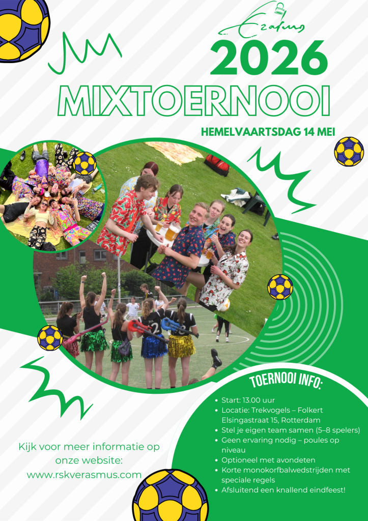Jaja! Ook dit jaar organiseert R.S.K.V. Erasmus weer een mixtoernooi tijdens Hemelvaartsdag! Op deze website vind je alle informatie over het gezelligste korfbaltoernooi van de regio, dat plaatsvindt op donderdag 14 mei 2026.